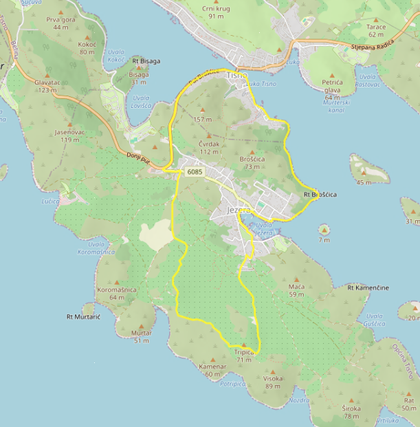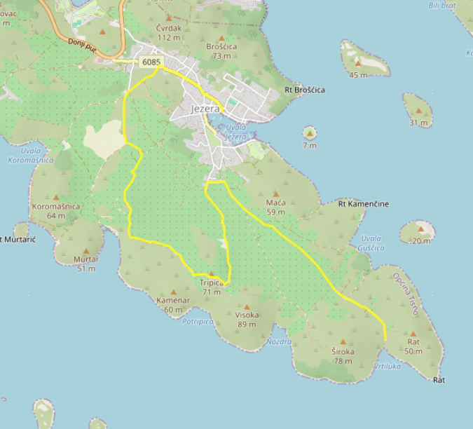 Description: Starting from Jezera, it leads uphill to the small church of St. Constance, then past the Church of Our Lady of Health to the spectacular Church of Our Lady of Caravaggio in Tisno. The route is perfect for those who want to explore the quieter interior of the island.